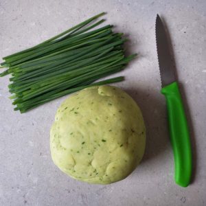 The original recipe suggests the addition of parsley but I’ve substituted chives as I have a plentiful supply in my garden from last summer which have overwintered successfully. I think the flavour combination of cheese and chives works well.  Adding fresh green herbs gives the pastry a tasteful green colour but when the biscuits are baked, they turn out a beautiful nutty brown colour.  You could use half and half parsley and chives which also works well.