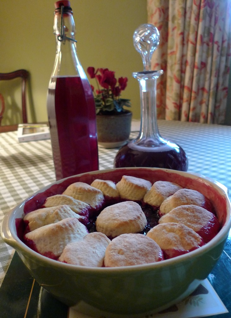 For a hearty supper we prepared  Morecombe shrimps, egg and cheese in ramekins, locally produced Cumberland sausage (well Cumberland is in the Lake District!) accompanied by baked beetroot, spinach and Charlotte potatoes, all freshly pulled and picked from the Bradley’s garden.  Sarah and I swopped dessert recipes while she prepared a Witherslack Damson Cobbler (recipe below)  for pudding.   An aperitif of damson gin in front of the woodburner warmed us all up.  Then to supper washed down with several glasses of Bob’s excellent damson wine –  ruby red, full bodied and surprisingly dry. More Shiraz than damson.  A unforgettable meal with my new